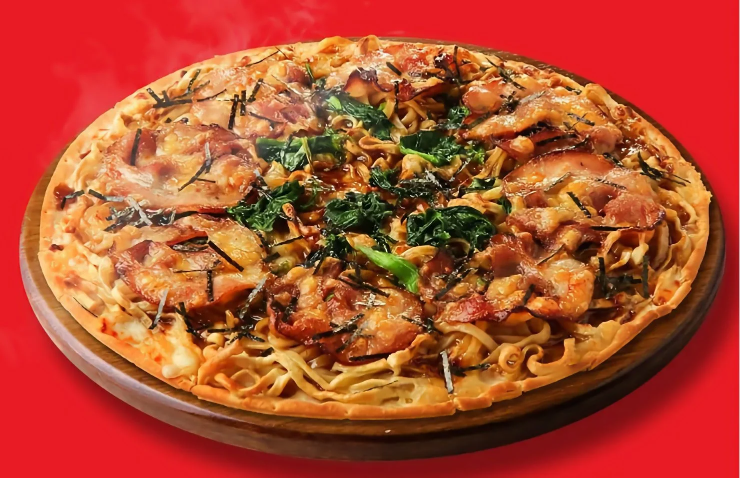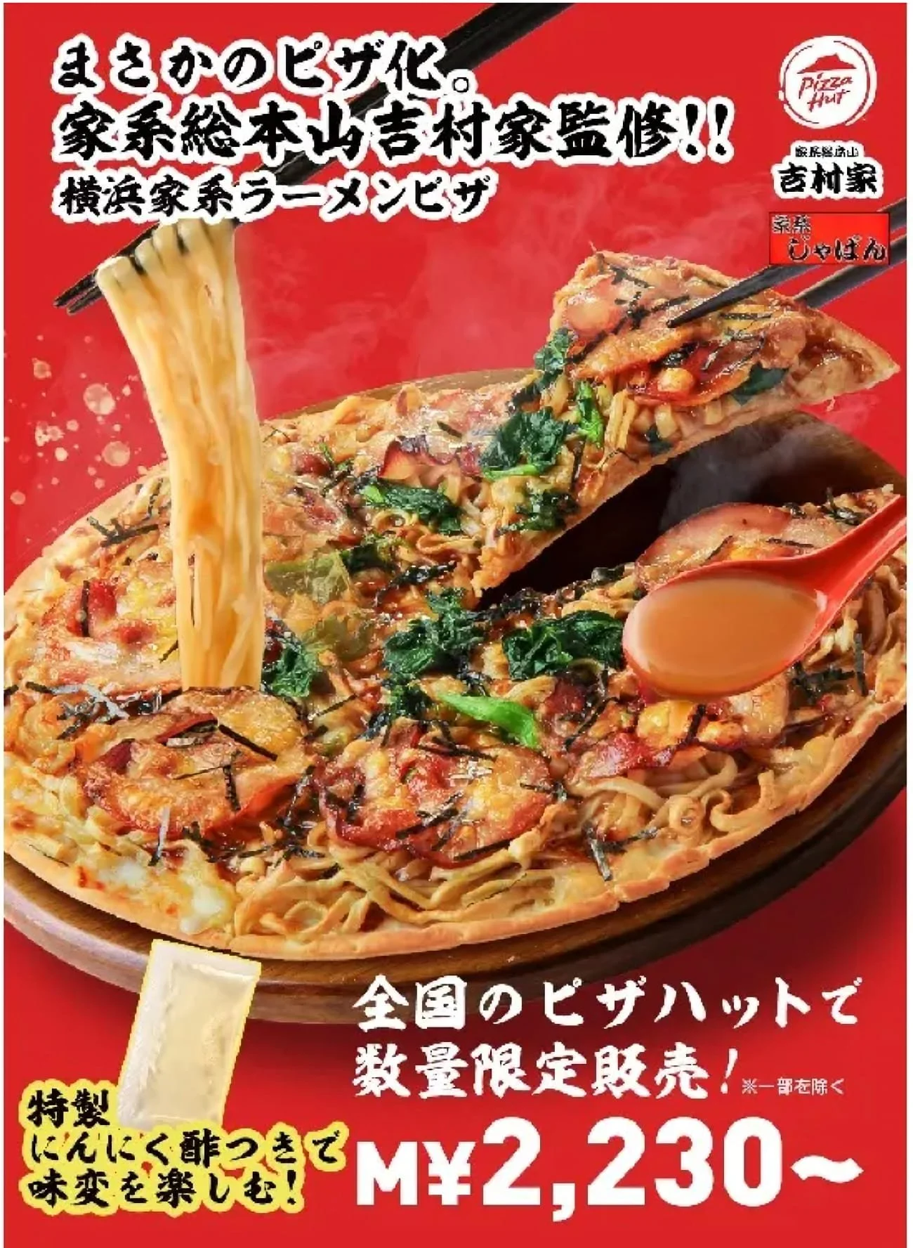 Pizza-kedjan Pizza Hut teamade upp sig med Yoshimura för att ta fram en pizza som smakar mer ramen än pizza. Såsen på denna pizza är en kombination av tonkotsu och kycklingbuljong och som fyllning finns det här bräserat fläskkött (chashu), spenat och, givetvis, ramen-nudlar. Det följer också med vitlöksvinäger och torkat sjögräs (nori) att ha på om man vill.